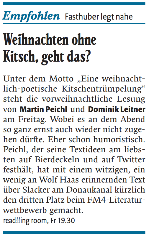 Am 15. Dezember 2017 luden Martin Peichl (>Wortheld) und ich zu unserer „Jubiläumslesung“ mit dem wunderbaren Titel „Der Kitsch in unseren Herzen (als Ausrede für eigentlich alles)“. Ein Jahr zuvor, am 19. Dezember 2016, hatten wir unsere erste gemeinsame Zweierlesung – die auch heute noch mit wunderbaren Erinnerungen in mir abgespeichert ist.